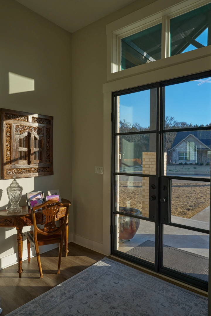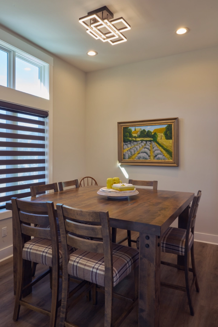 Throughout the kitchen, dining, and bath areas, I chose deeper, more saturated colors—navy on the island and laundry cabinetry, sage tile in the shower—to add personality and depth without overwhelming the spaces. Natural wood tables, classic hardware, and carefully edited decor keep the interior feeling warm, inviting, and easy to live in for homeowners who appreciate traditional character with a fresh perspective.