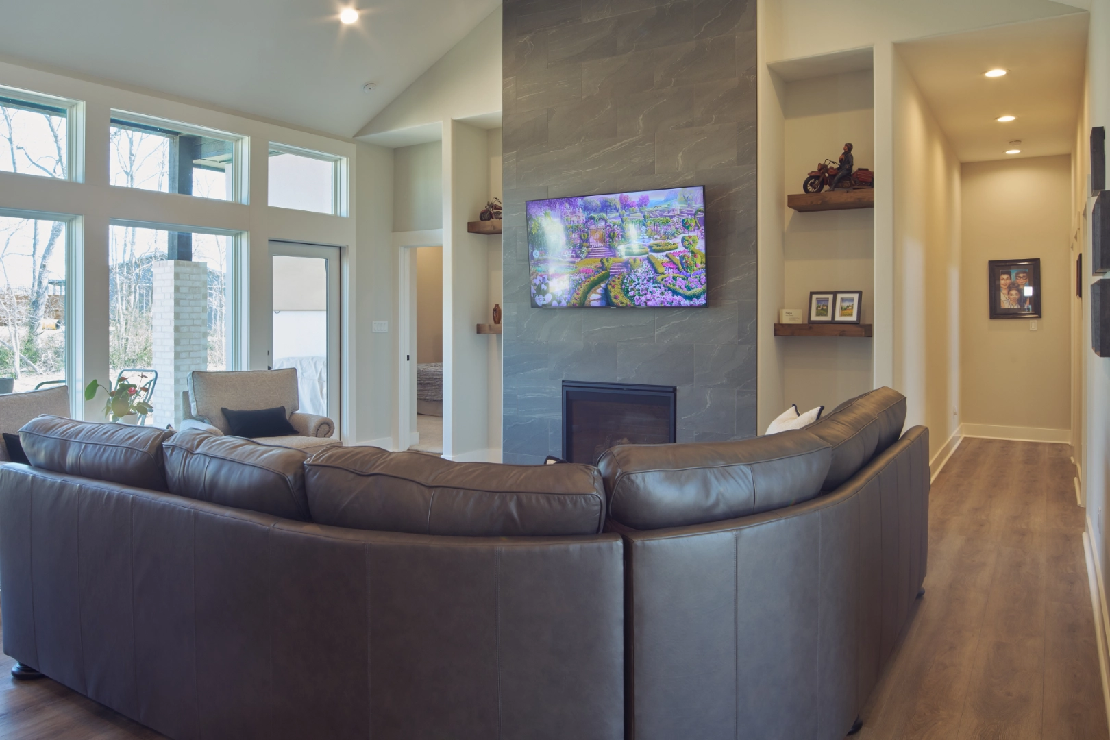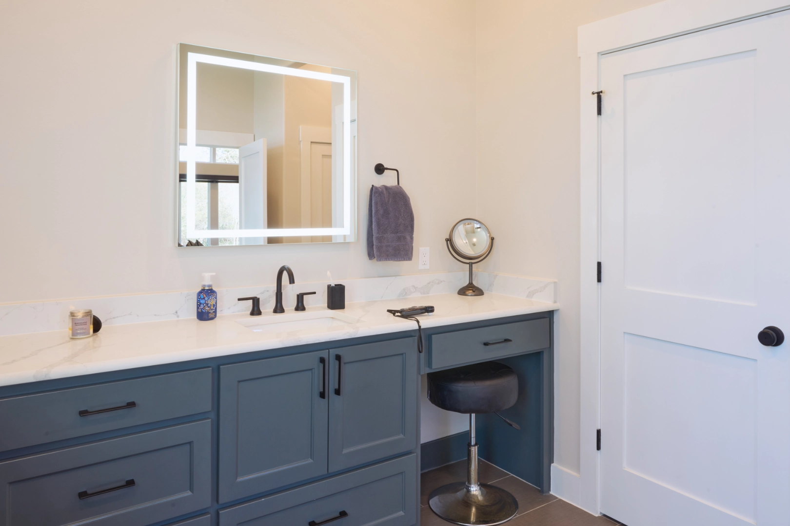 Big Garage House is a welcoming, character-filled interior where I used rich navy cabinetry, warm wood tones, and soft sage accents to create rooms that feel both grounded and refined. Thoughtful color choices, comfortable furnishings, and layered finishes give the home a collected, timeless quality that works beautifully for everyday living.