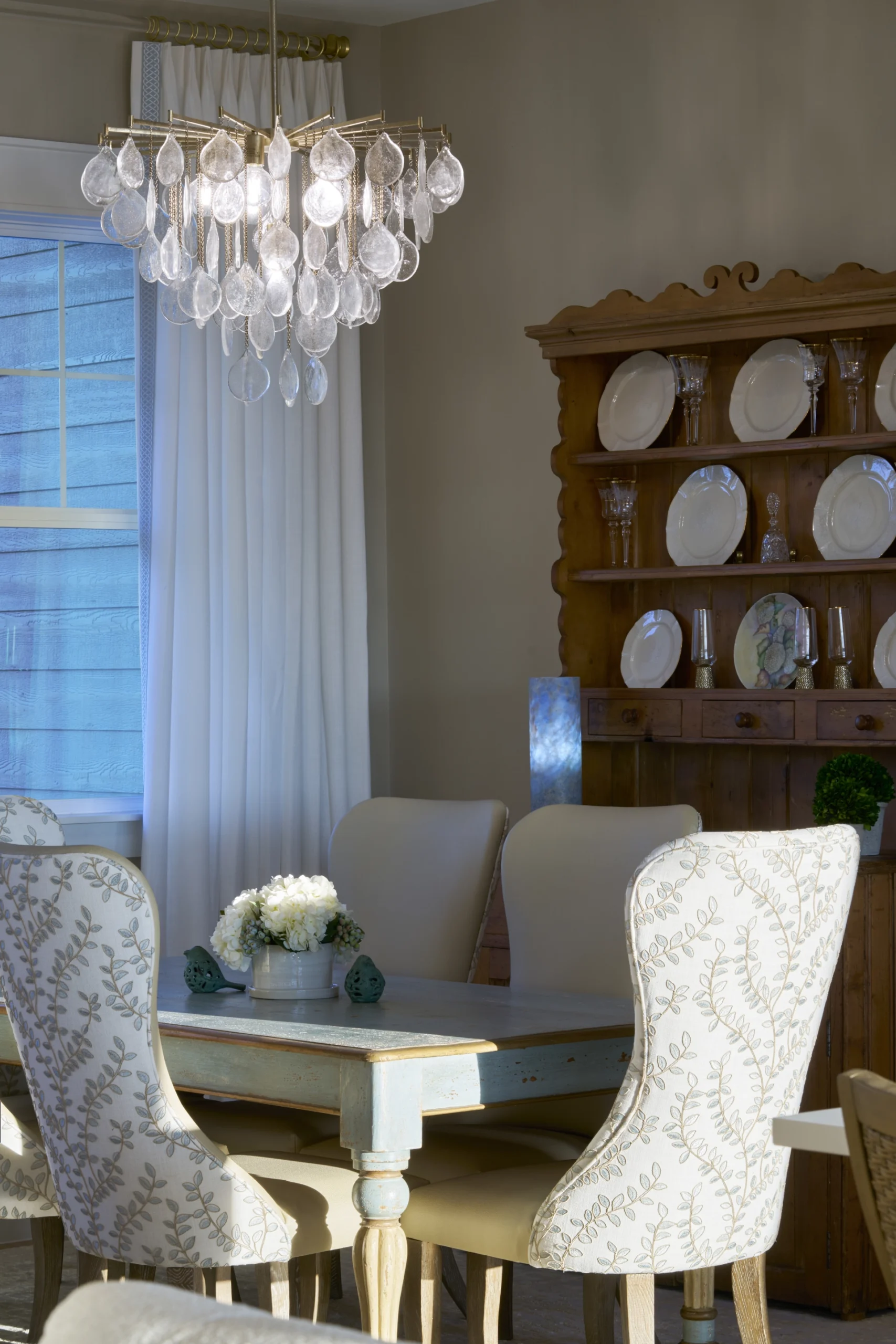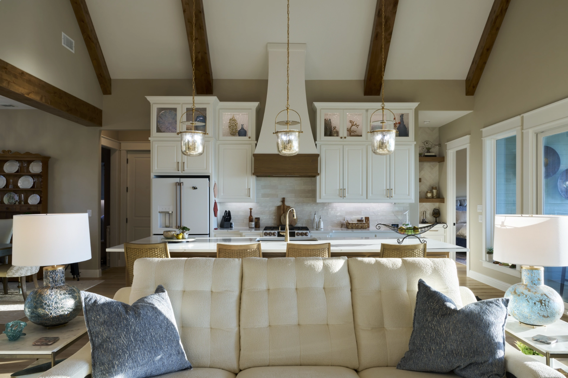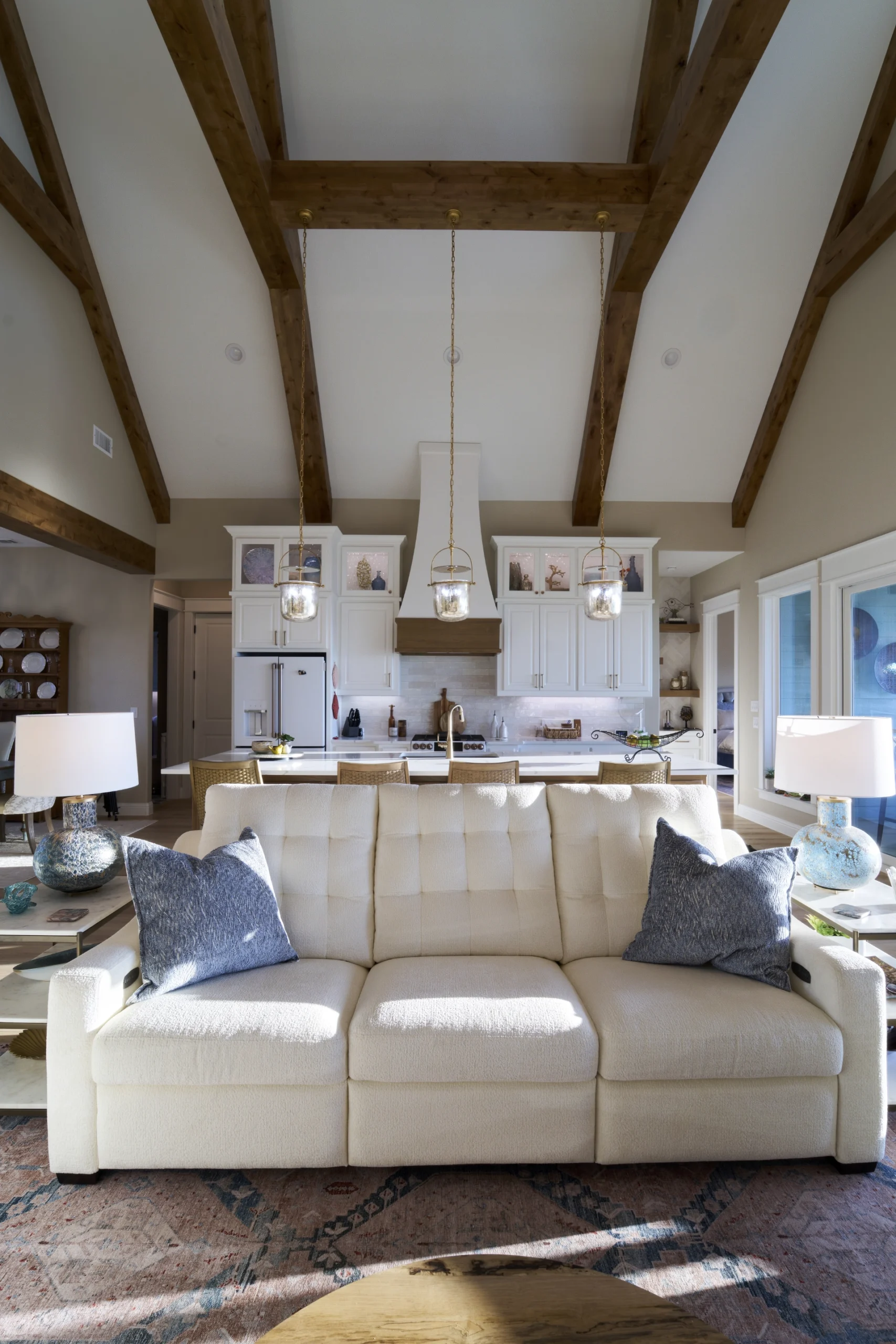 Across the living, dining, and kitchen areas, I focused on simple, comfortable layouts that support slow mornings, quiet evenings, and easy weekends with family. Natural light and edited decor highlight the blues throughout the home, creating a soothing, lake‑inspired backdrop that feels timeless and inviting.