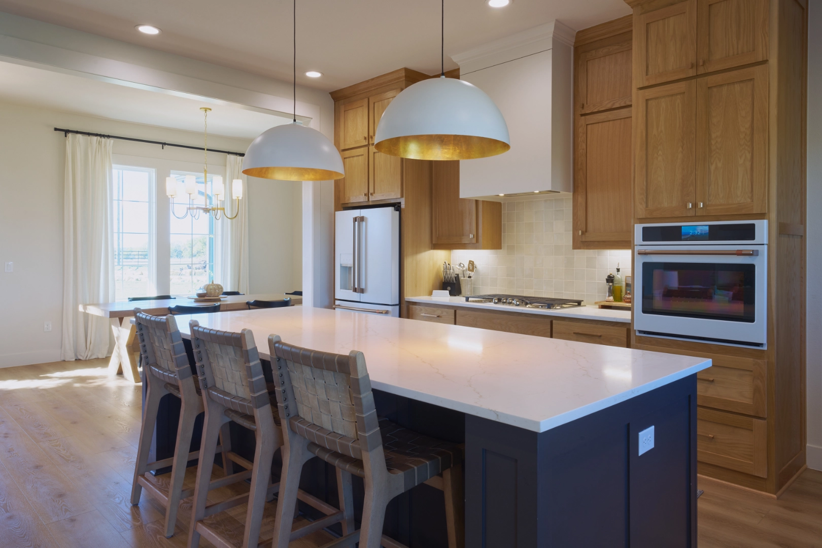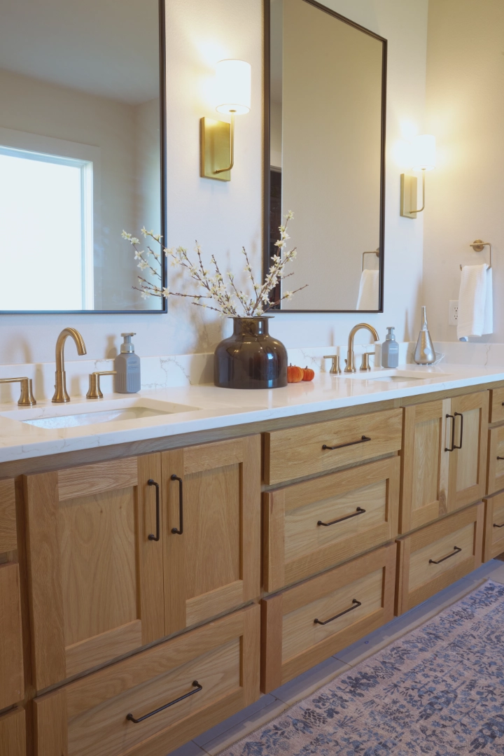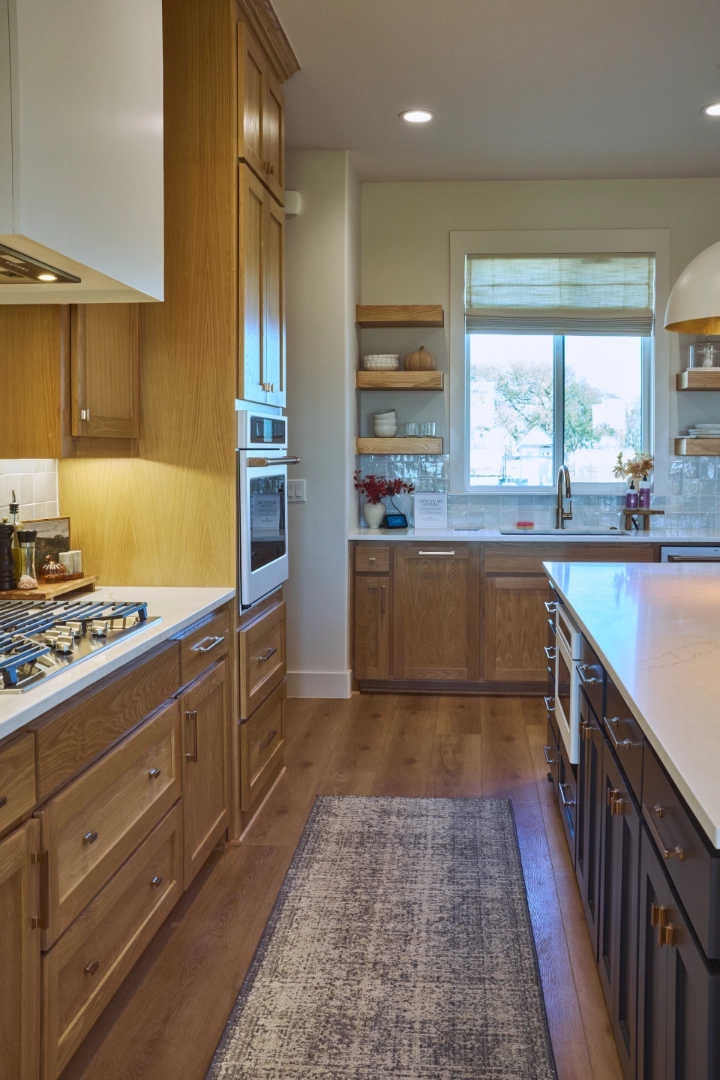 Bright and Custom Retreat at Lake Texoma is a light-filled, welcoming interior where I used warm wood cabinetry, open shelving, and a mix of modern and rustic finishes to create a home that feels custom, comfortable, and connected to the lake. Natural wood tones, a sleek gray island, and thoughtful details give the space a fresh, approachable character that works beautifully for everyday living and lakeside entertaining.