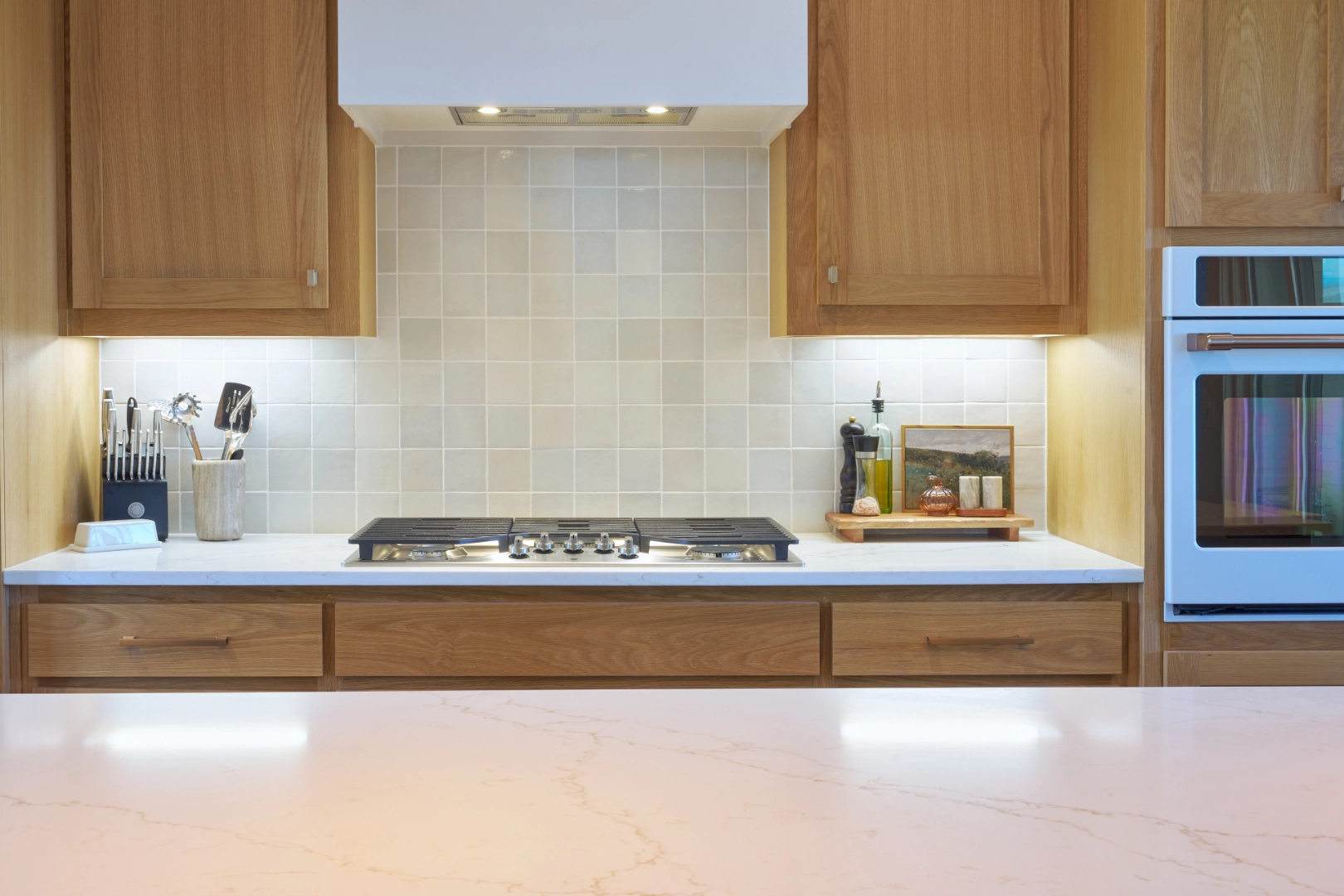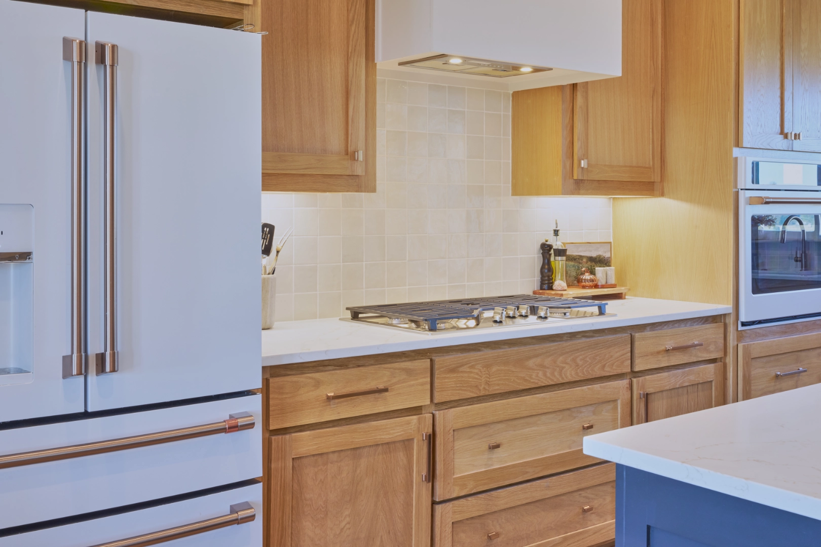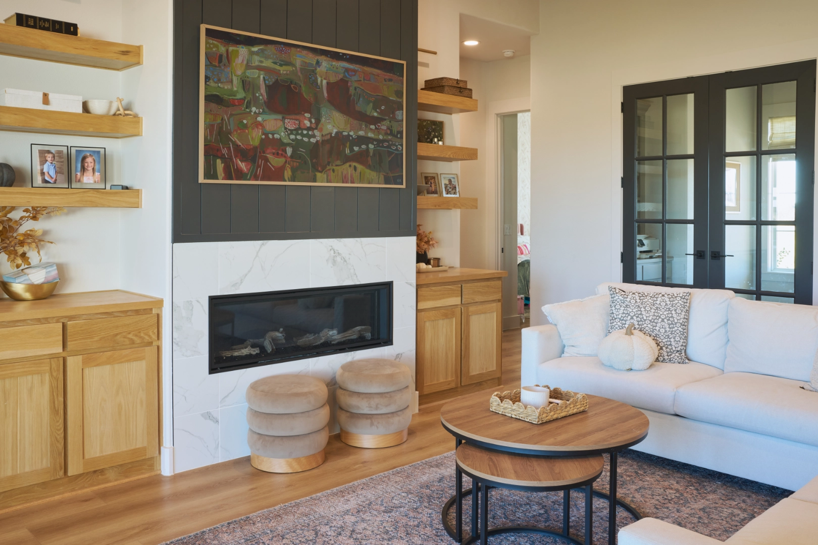 Bright and Custom Retreat at Lake Texoma is a light-filled, welcoming interior where I used warm wood cabinetry, open shelving, and a mix of modern and rustic finishes to create a home that feels custom, comfortable, and connected to the lake. Natural wood tones, a sleek gray island, and thoughtful details give the space a fresh, approachable character that works beautifully for everyday living and lakeside entertaining.