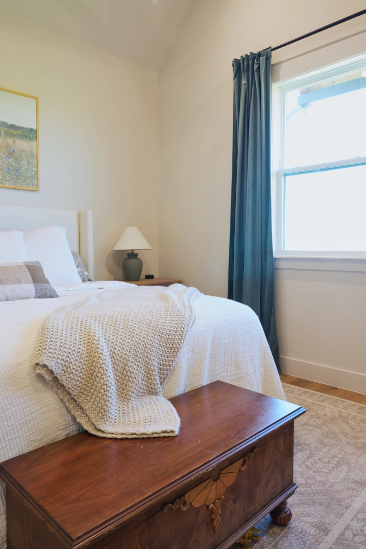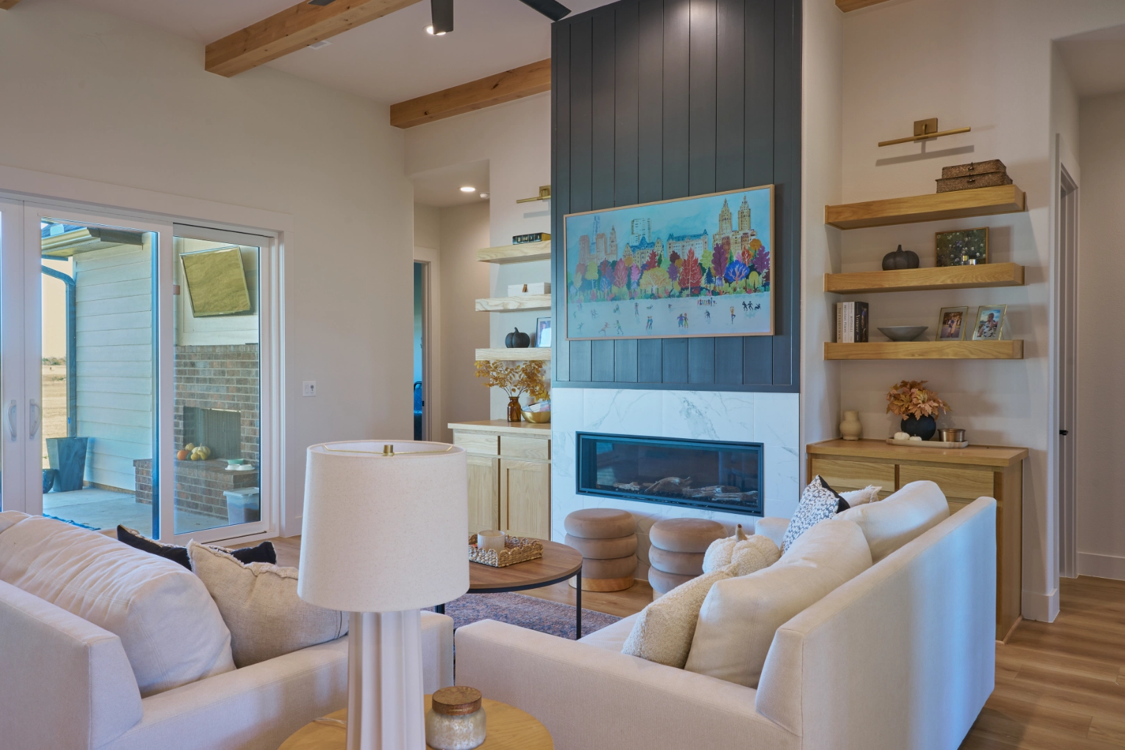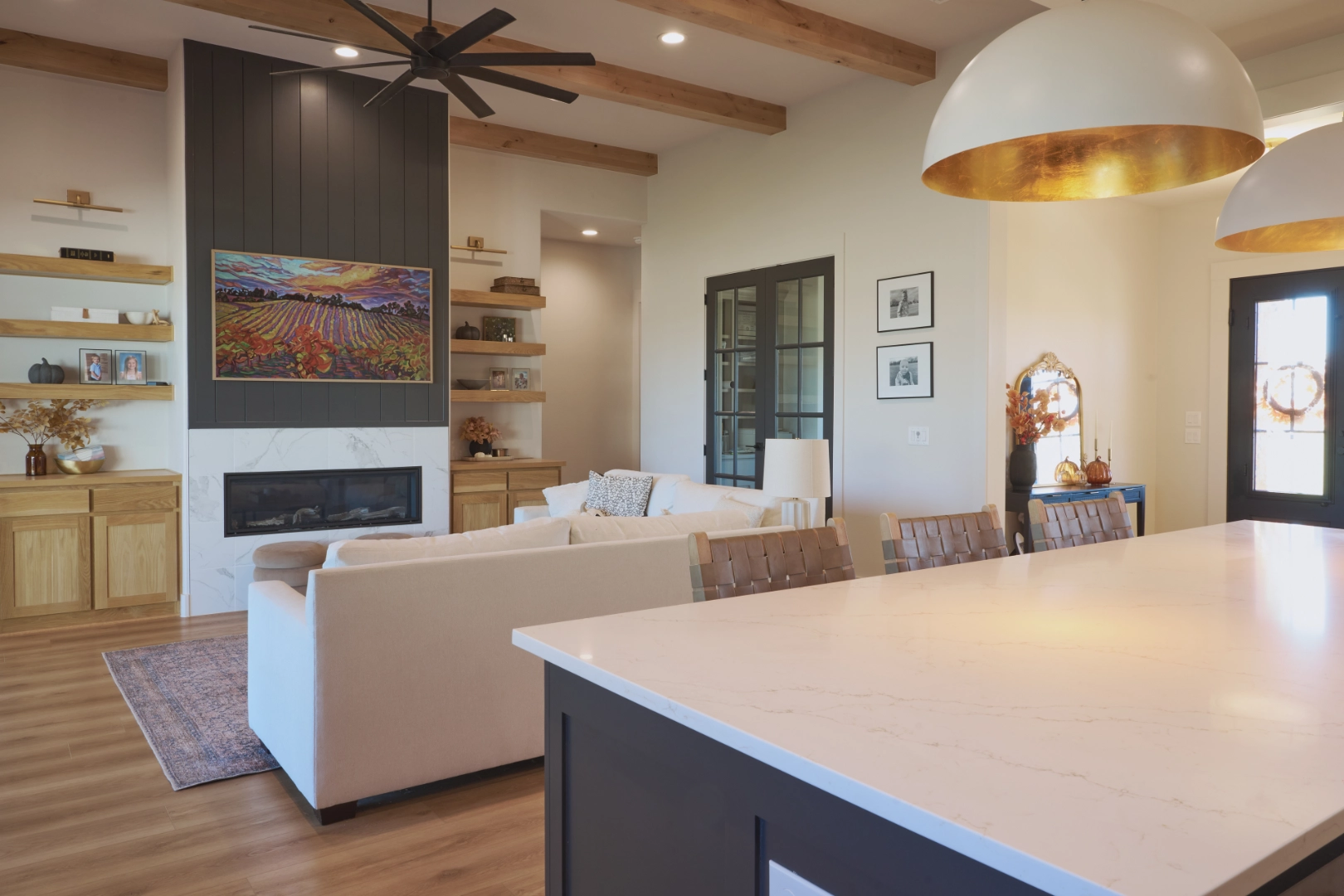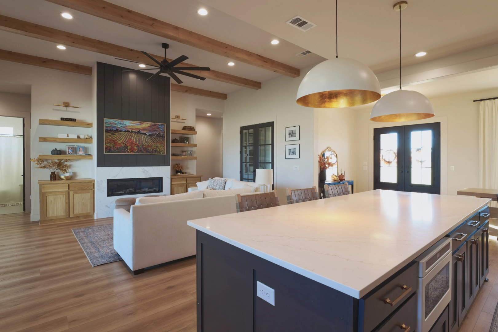 Throughout the kitchen and main living areas, I focused on balancing warmth with function—rich wood cabinets paired with open shelving for display, statement pendant lighting with brass accents, and large windows that frame the water views. Exposed wood beams, carefully chosen fixtures, and a layered palette of neutrals keep the interior feeling bright, inviting, and perfectly suited to life at Lake Texoma.
