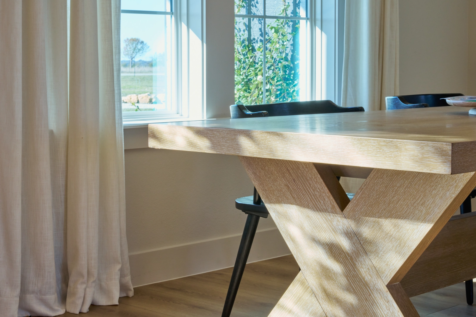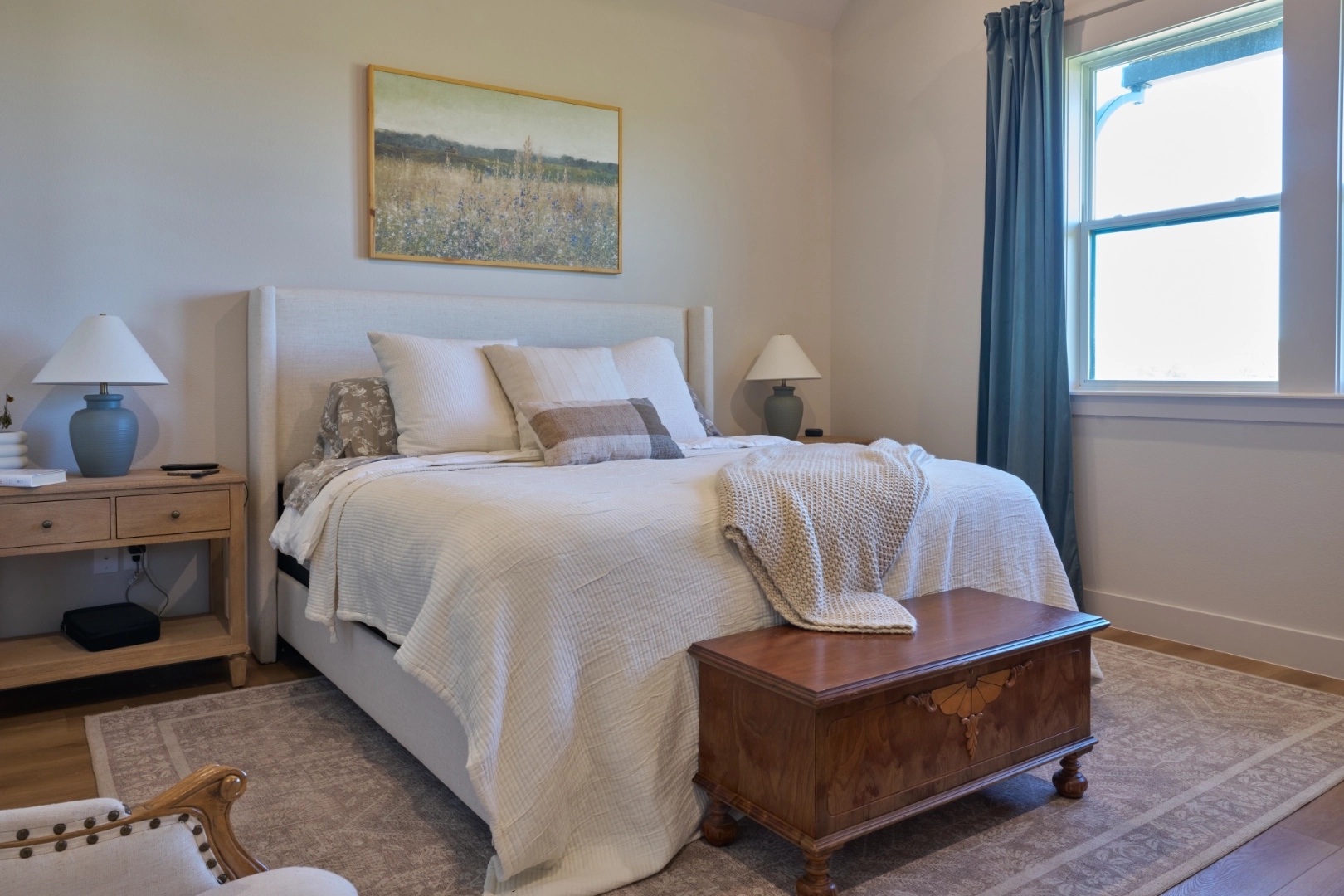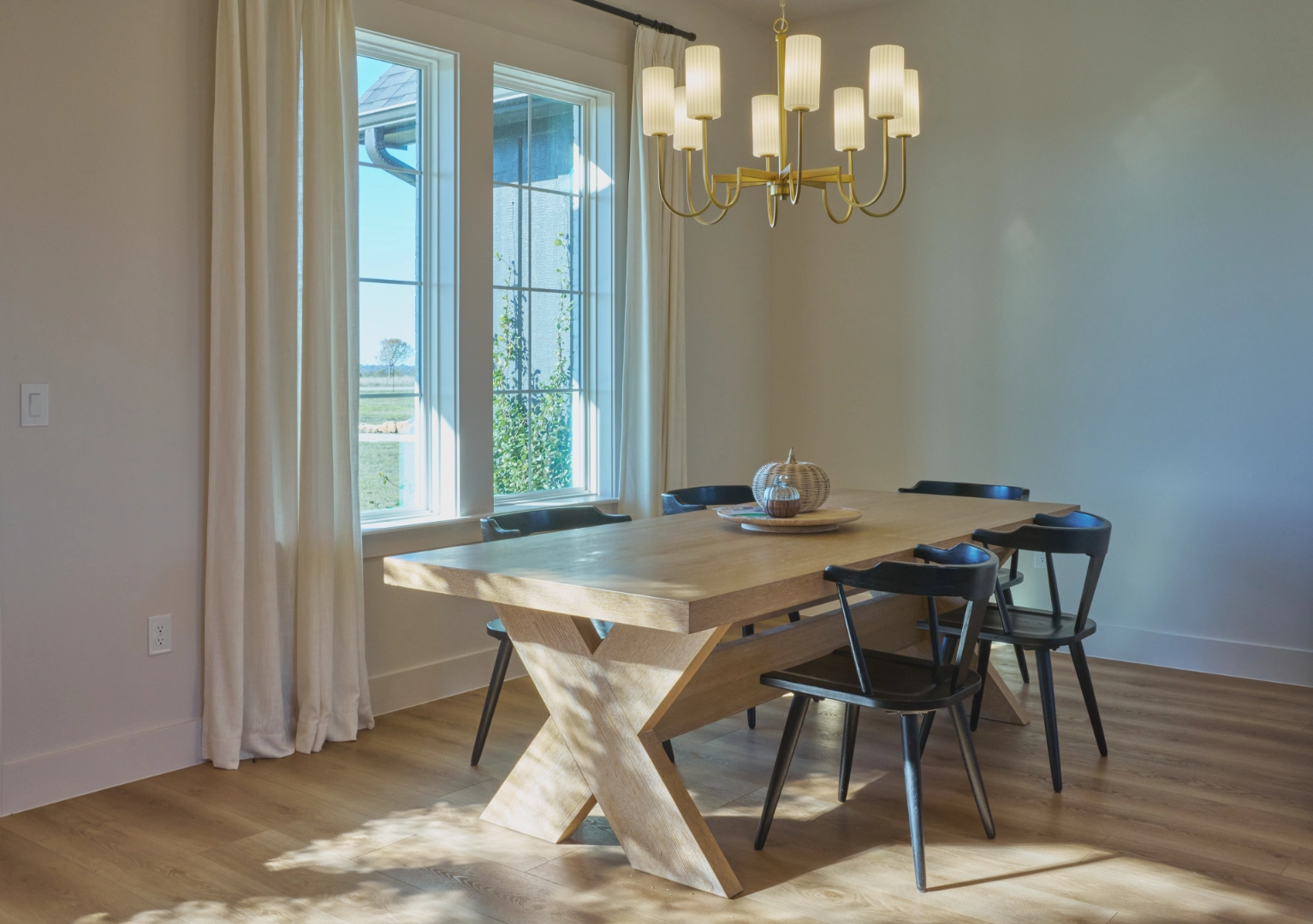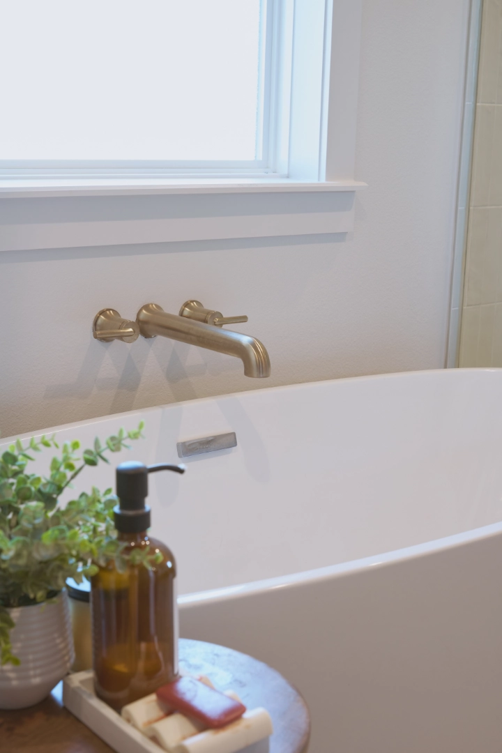 Throughout the kitchen and main living areas, I focused on balancing warmth with function—rich wood cabinets paired with open shelving for display, statement pendant lighting with brass accents, and large windows that frame the water views. Exposed wood beams, carefully chosen fixtures, and a layered palette of neutrals keep the interior feeling bright, inviting, and perfectly suited to life at Lake Texoma.