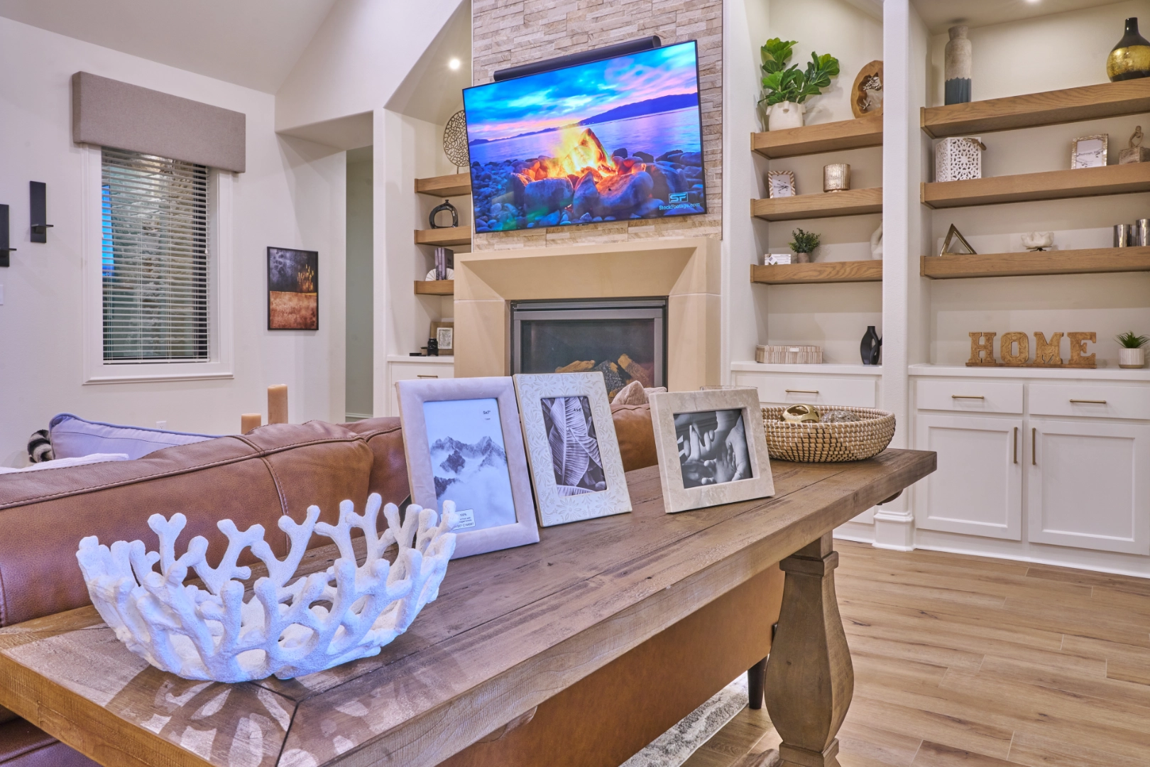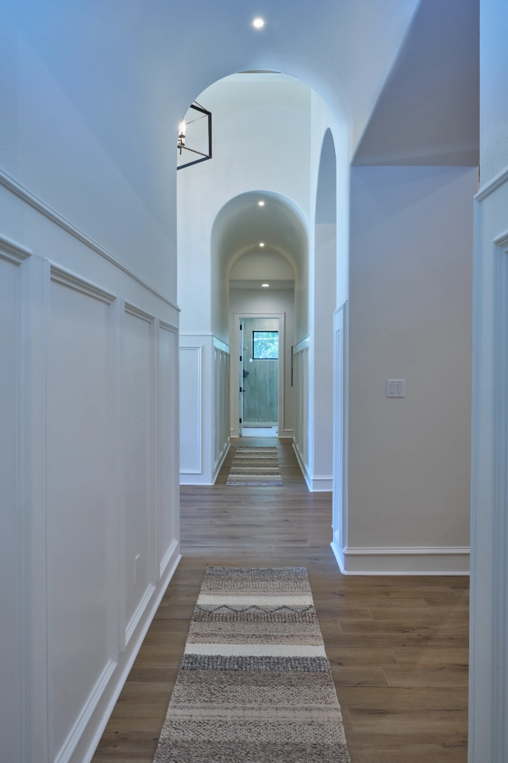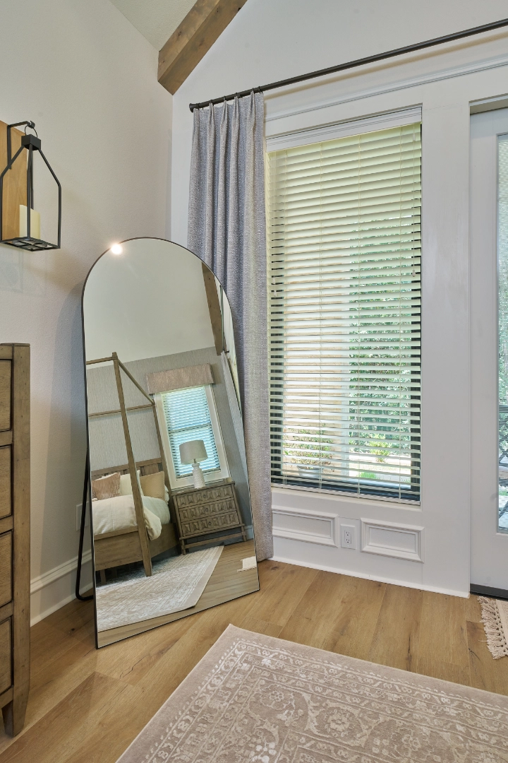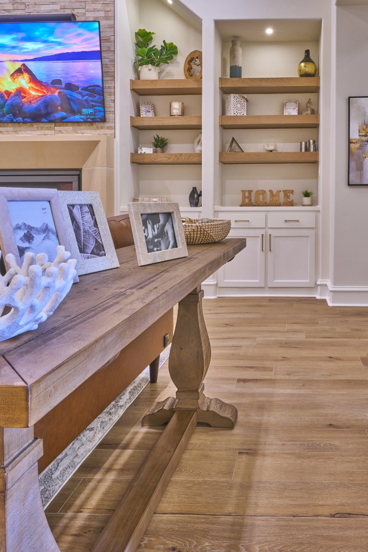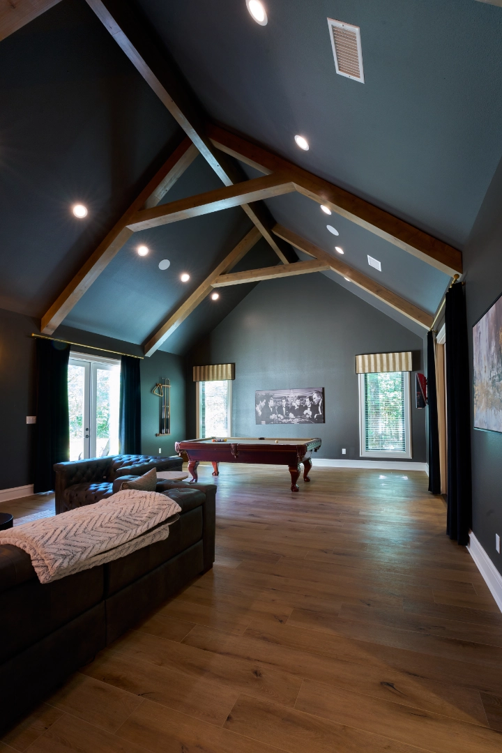 Throughout this game room and lounge area, I focused on creating drama and comfort—dark wall colors that make the space feel intimate and refined, tufted leather seating that invites you to settle in, and natural wood floors and beams that add warmth to balance the darker tones. Thoughtful details, a pool table as the focal point, and carefully chosen decor keep the interior feeling collected, inviting, and ready for homeowners who love to entertain in style.