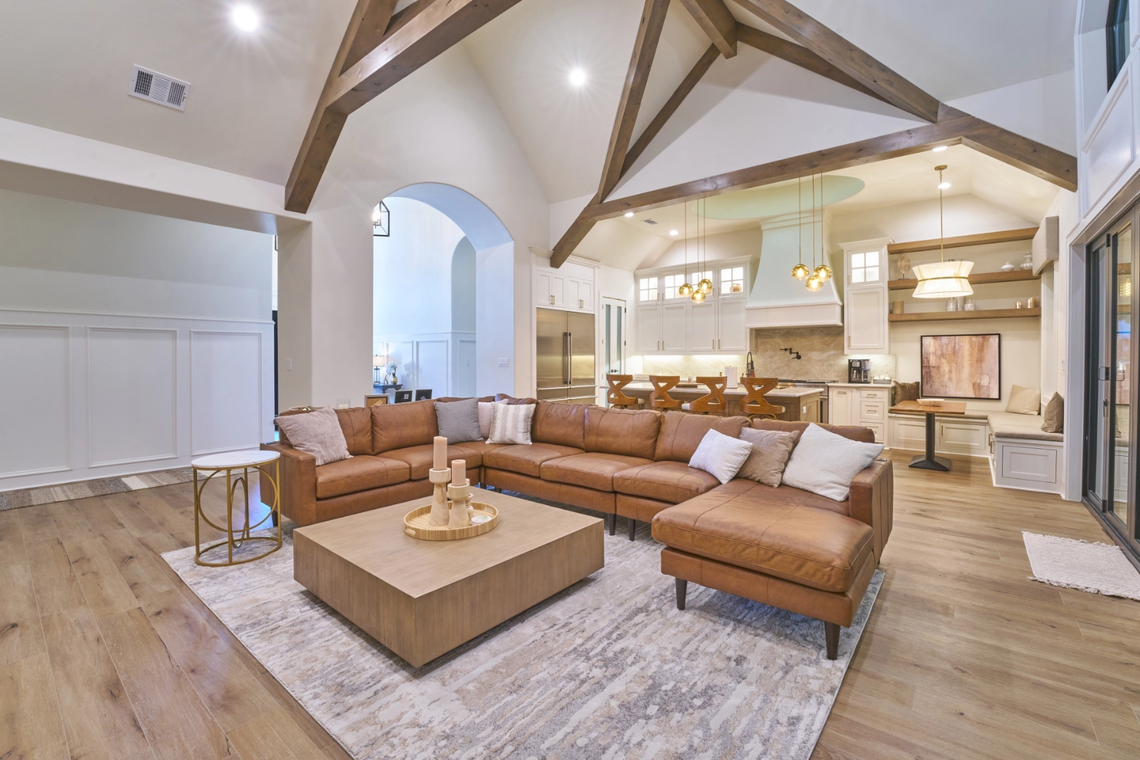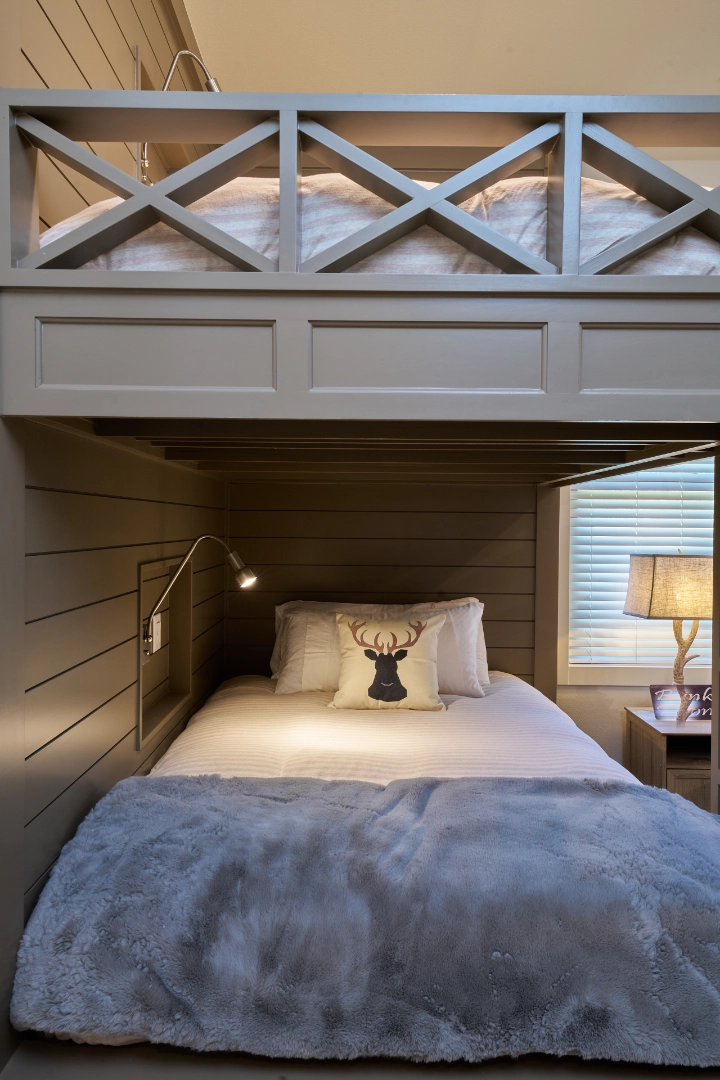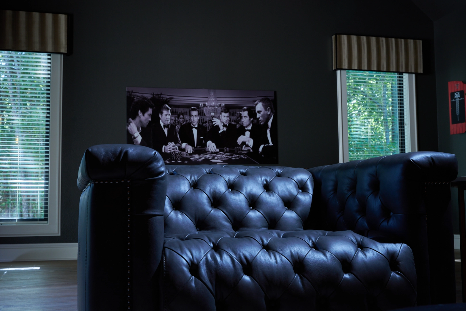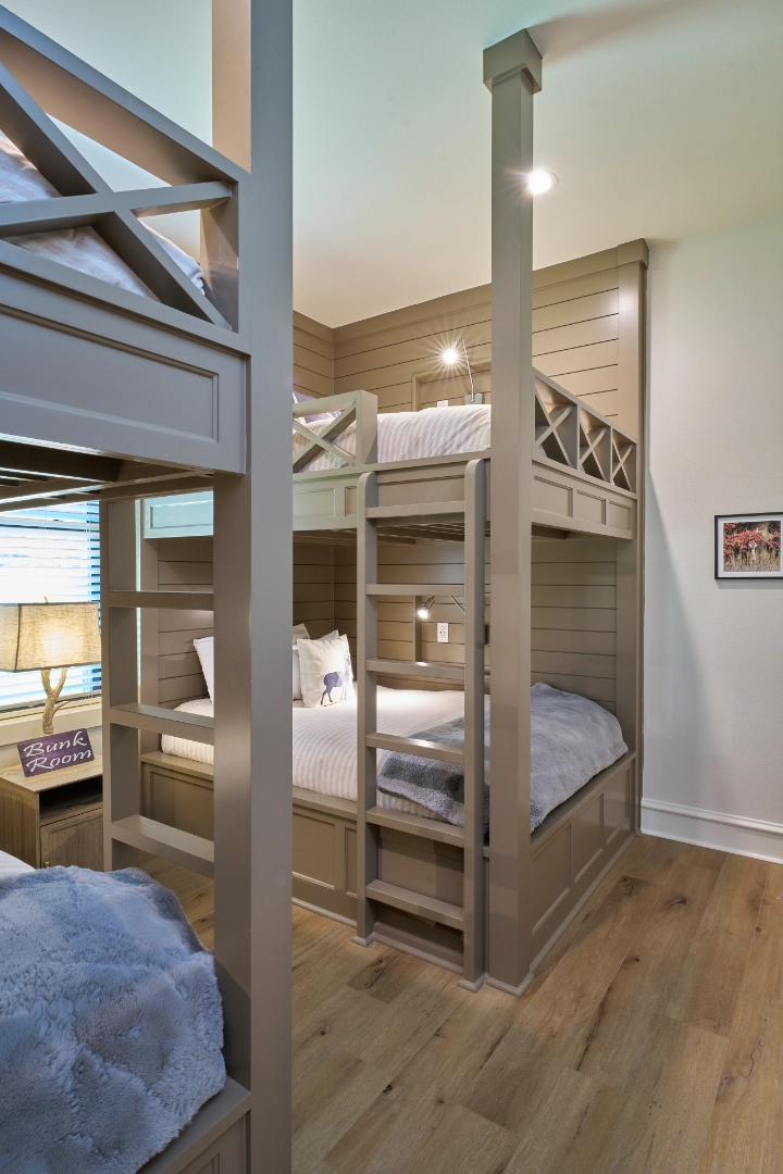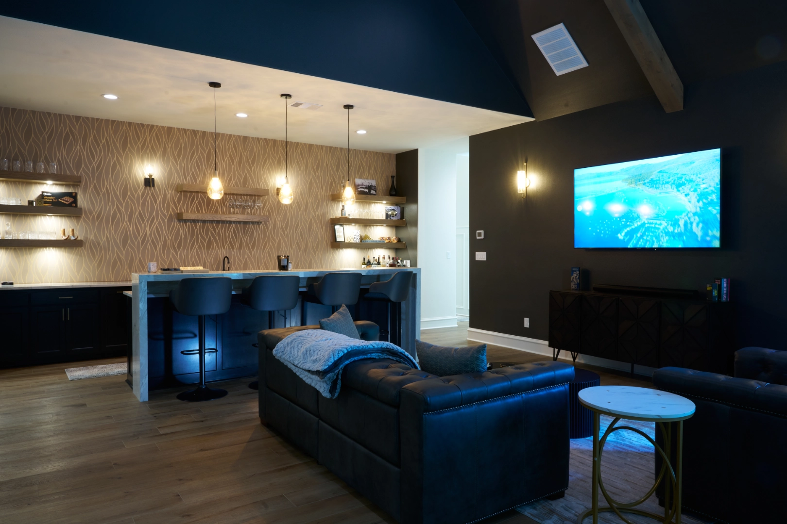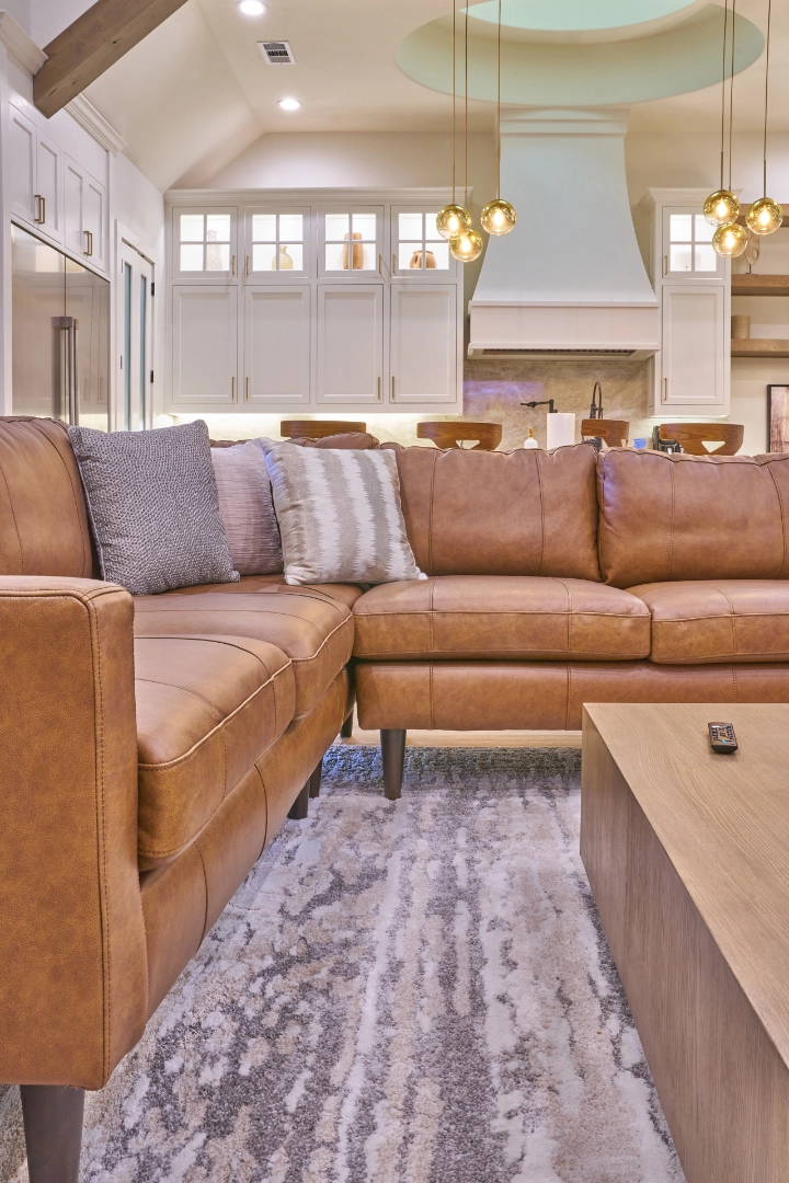 Golf Club Oasis is a bold, moody interior where I used deep charcoal walls, warm wood accents, and rich leather furnishings to create a dedicated entertainment space that feels like a private club. Vaulted ceilings with exposed wood beams, curated artwork, and layered lighting give the room a sophisticated, masculine character that’s perfect for game nights and relaxed gatherings.