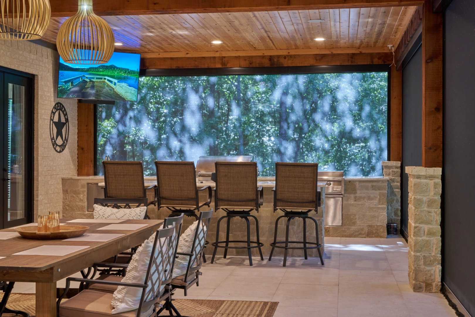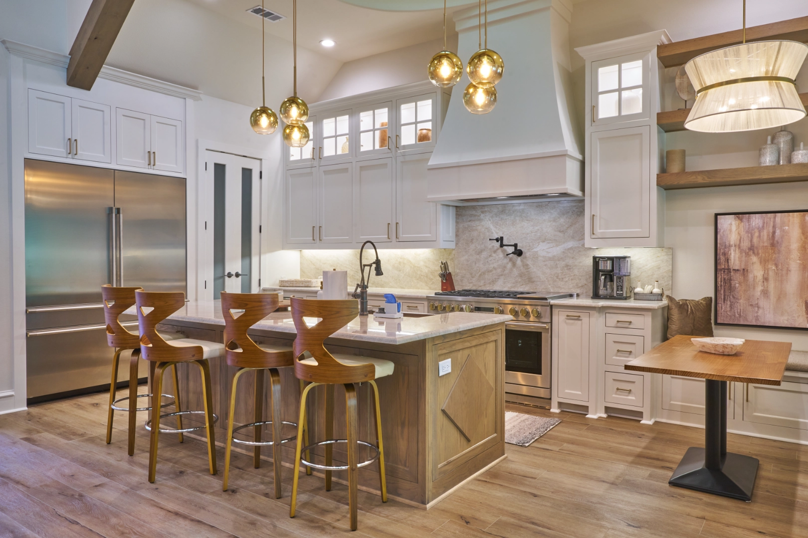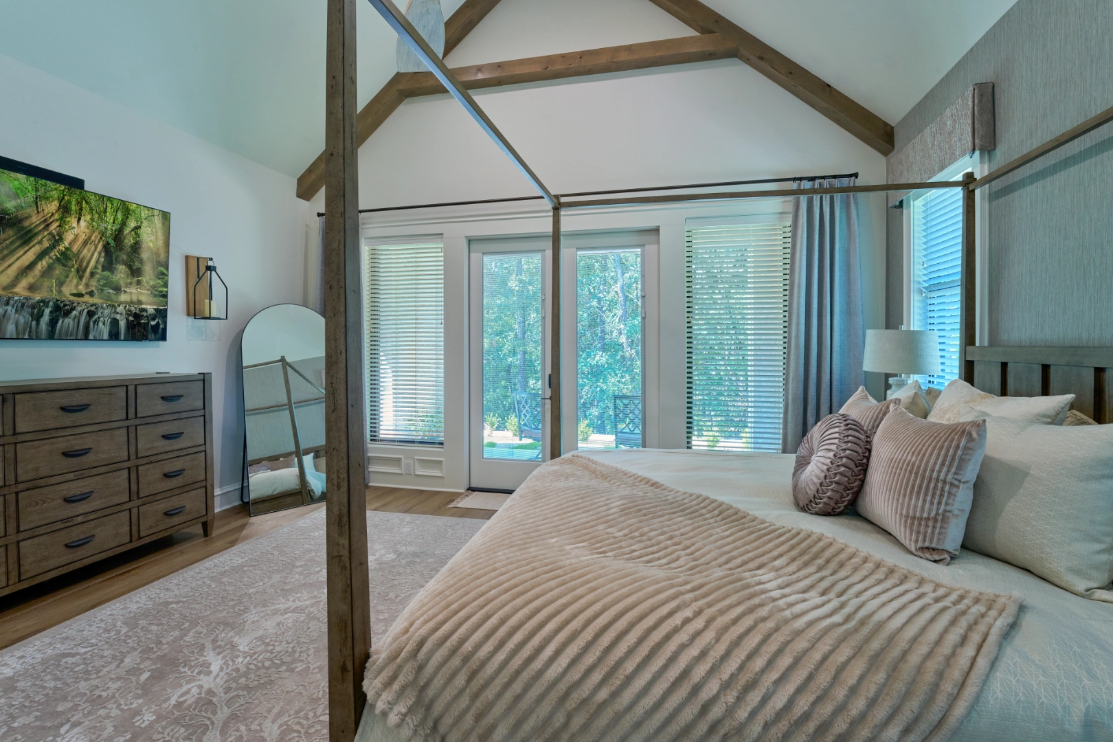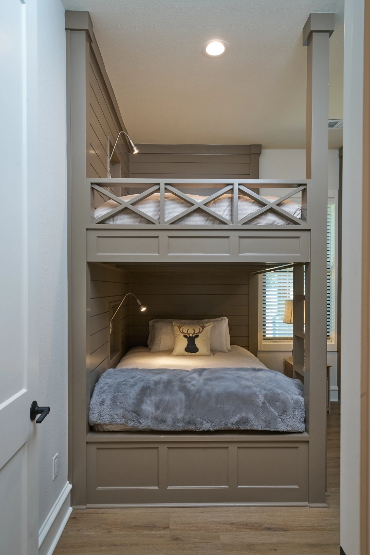 Golf Club Oasis is a bold, moody interior where I used deep charcoal walls, warm wood accents, and rich leather furnishings to create a dedicated entertainment space that feels like a private club. Vaulted ceilings with exposed wood beams, curated artwork, and layered lighting give the room a sophisticated, masculine character that’s perfect for game nights and relaxed gatherings.