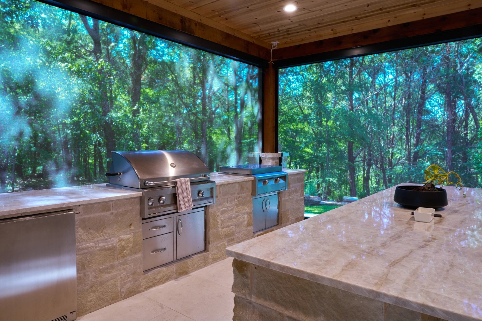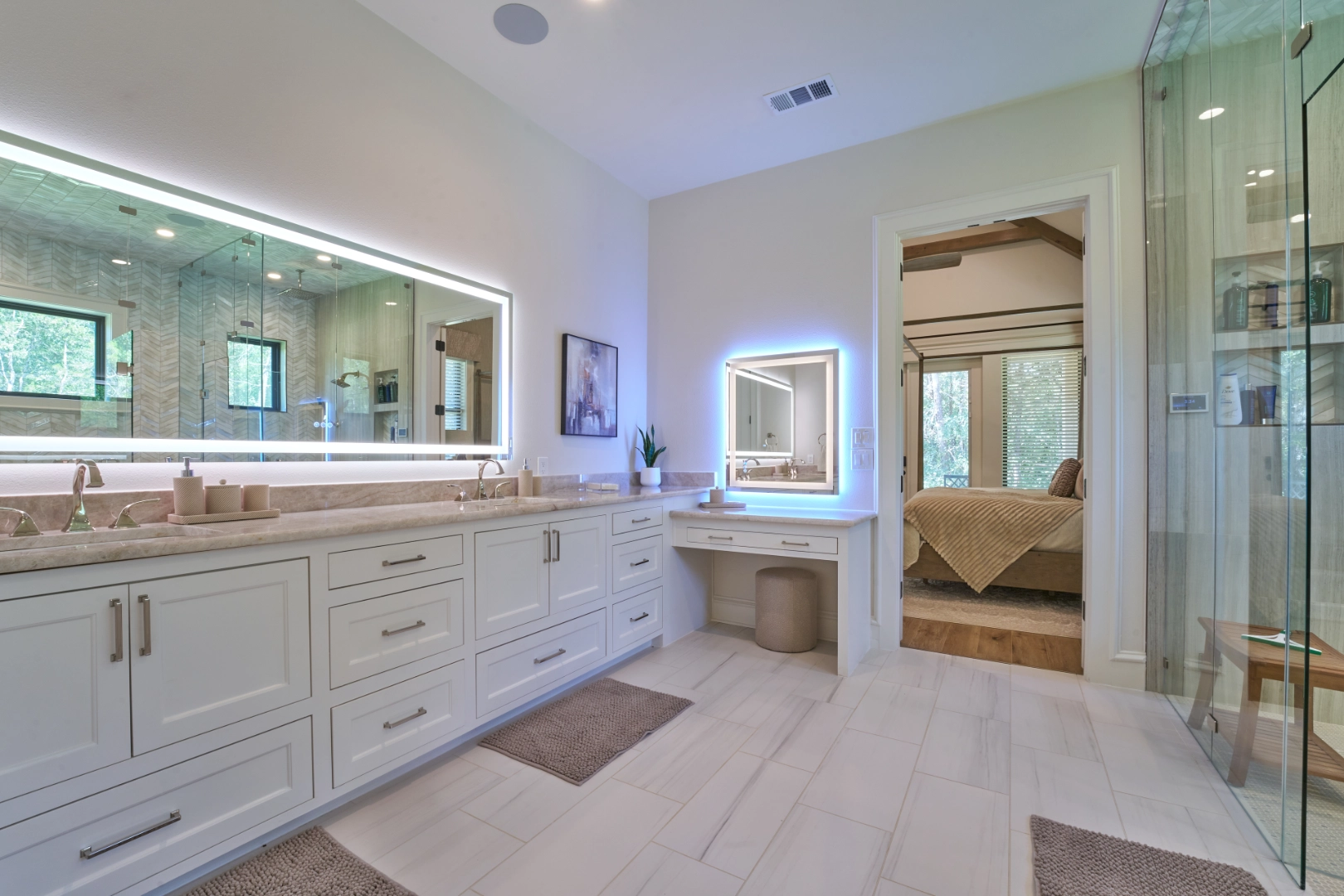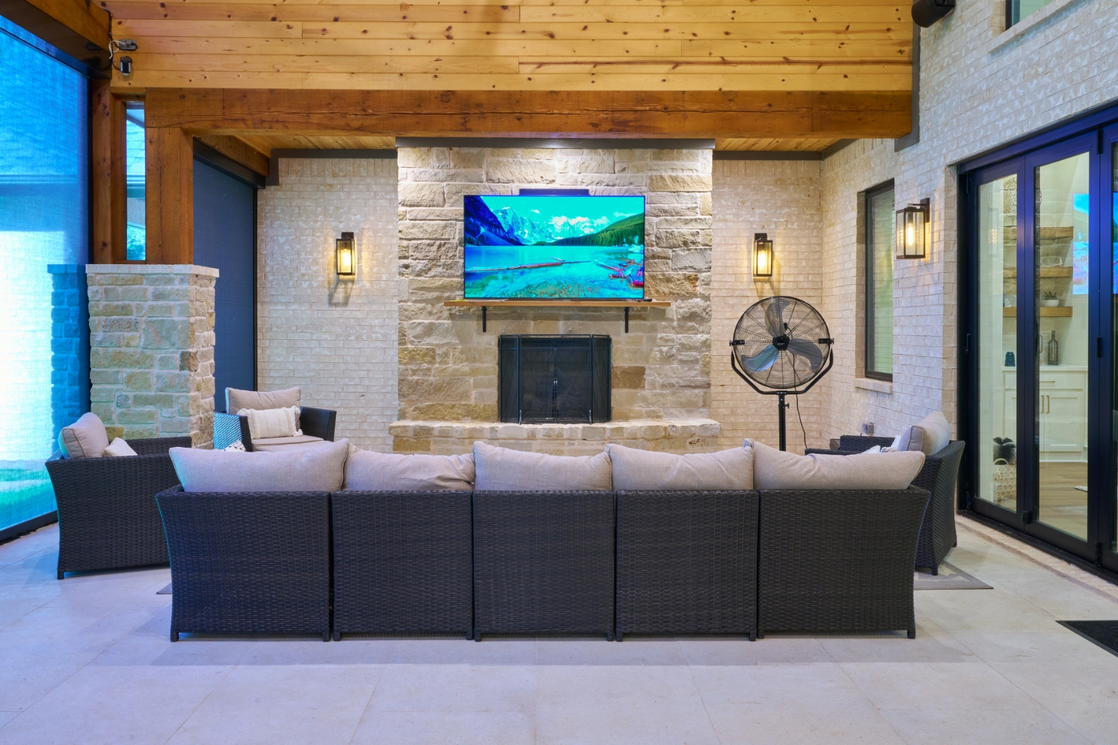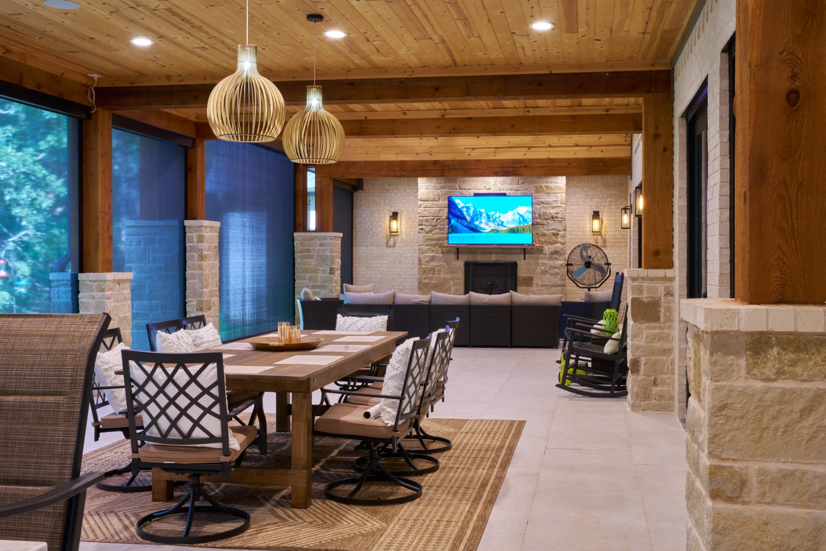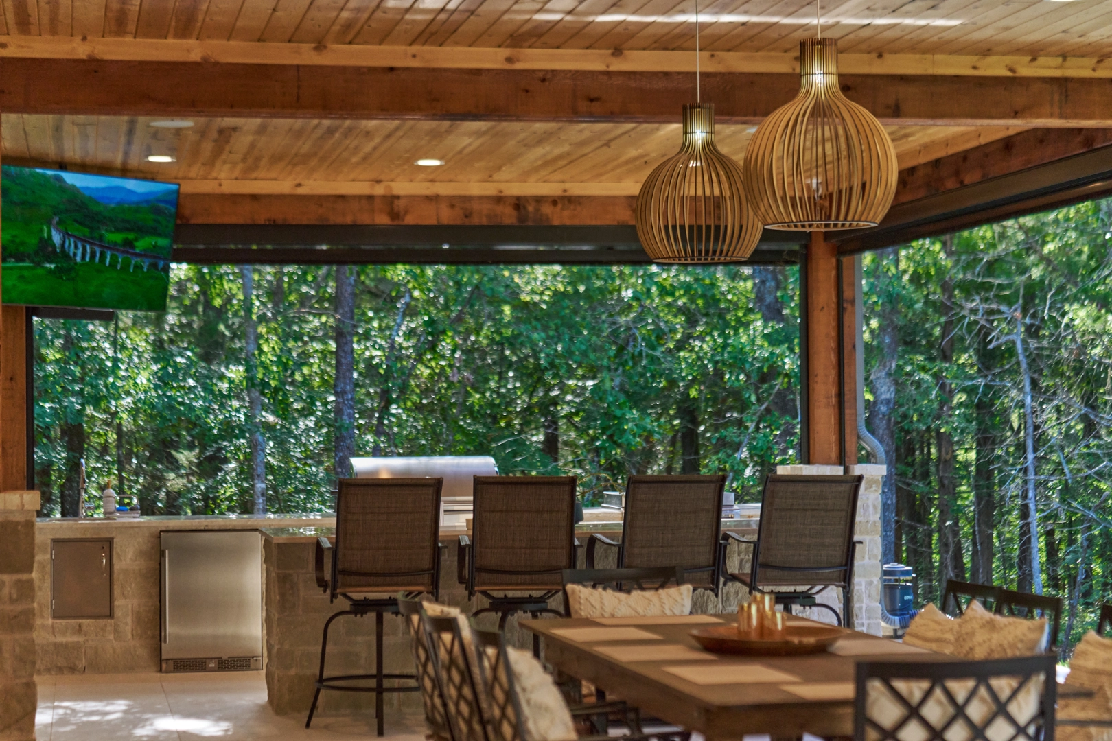 Golf Club Oasis is a bold, moody interior where I used deep charcoal walls, warm wood accents, and rich leather furnishings to create a dedicated entertainment space that feels like a private club. Vaulted ceilings with exposed wood beams, curated artwork, and layered lighting give the room a sophisticated, masculine character that’s perfect for game nights and relaxed gatherings.