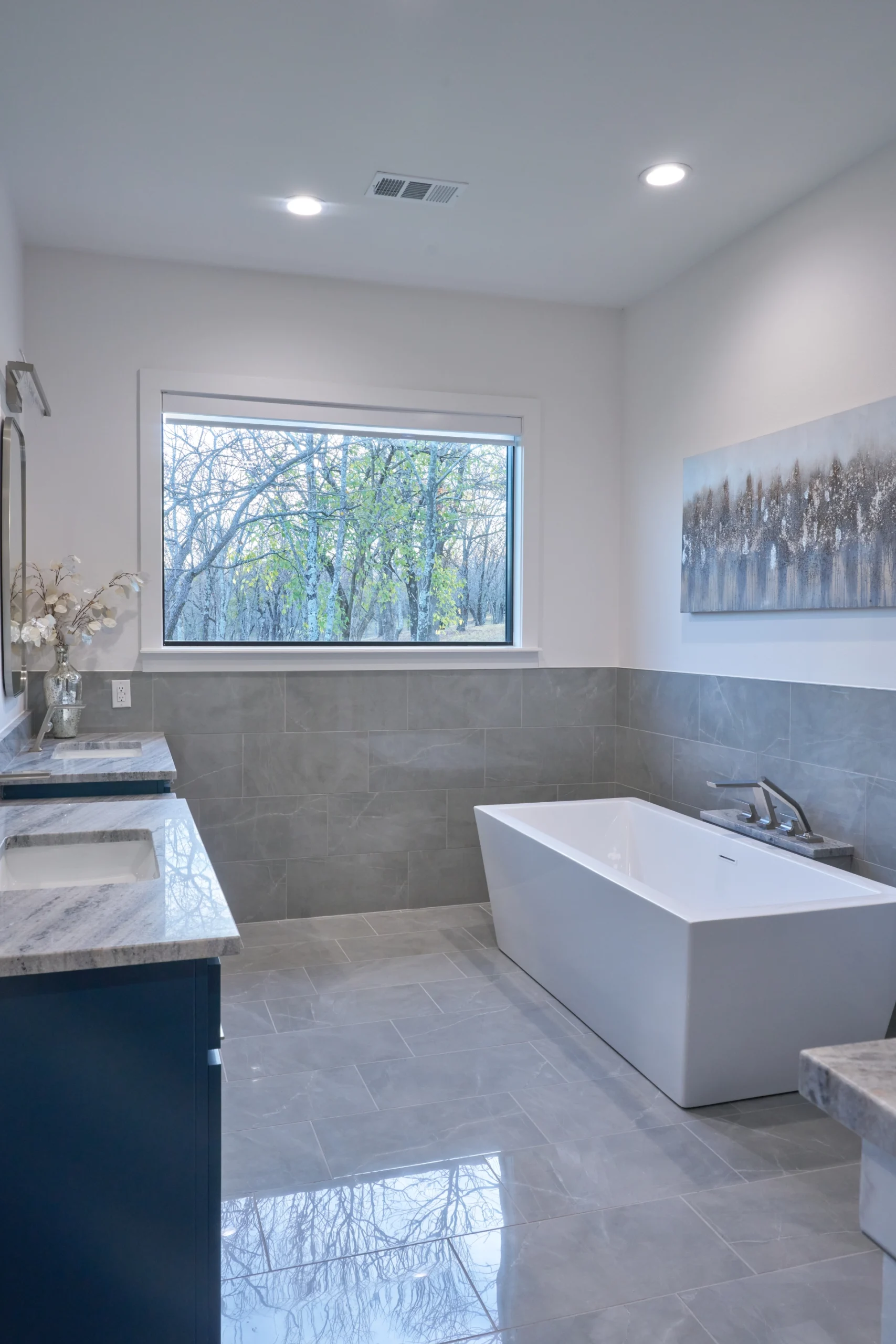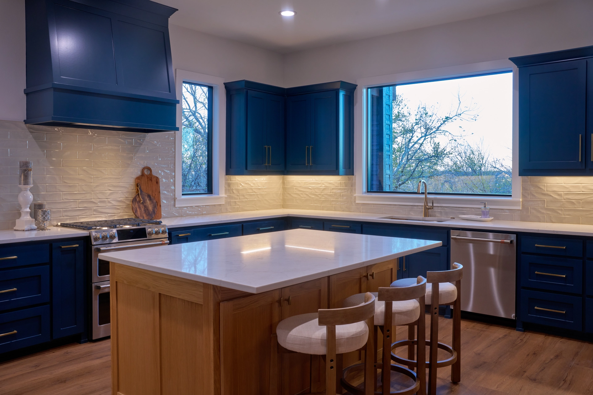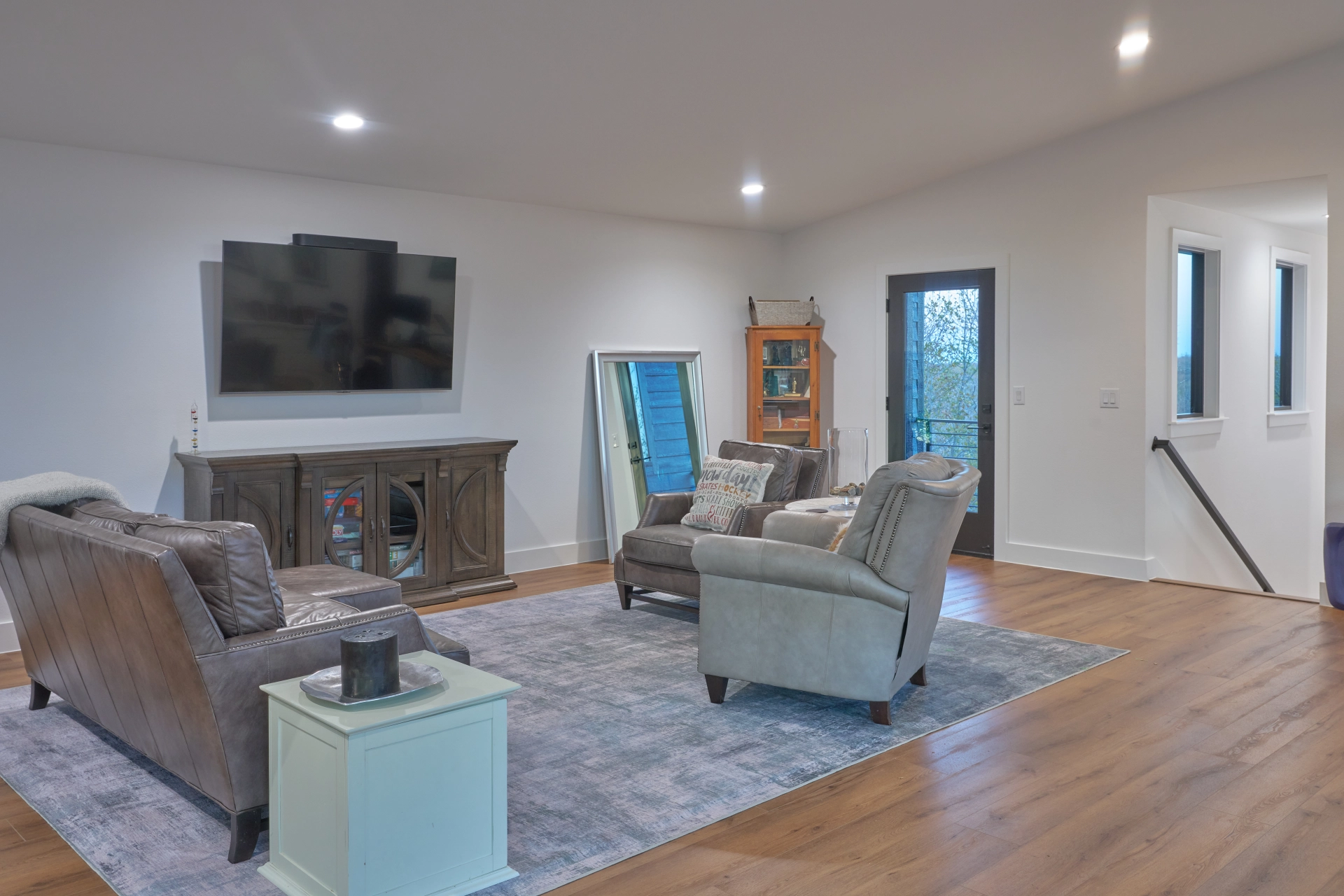 In the main living areas, I used an open, easy flow between kitchen, dining, and living so the space feels effortless for everyday living and weekends with family. Comfortable furnishings, durable finishes, and thoughtful lighting keep the interiors relaxed, refined, and ready for real life at the lake.