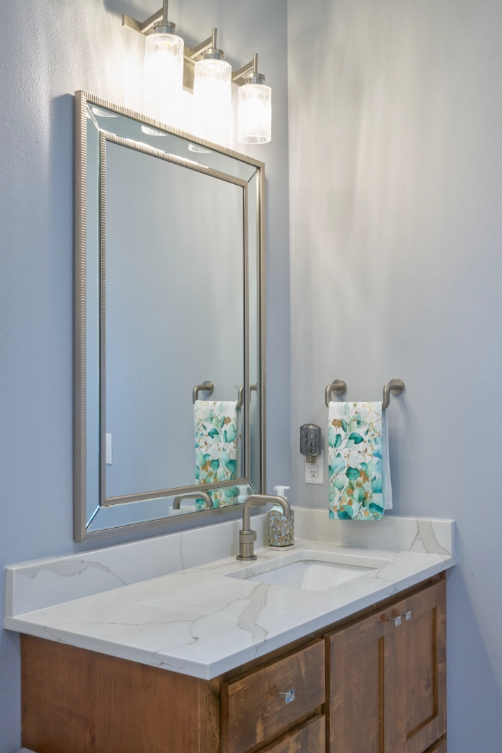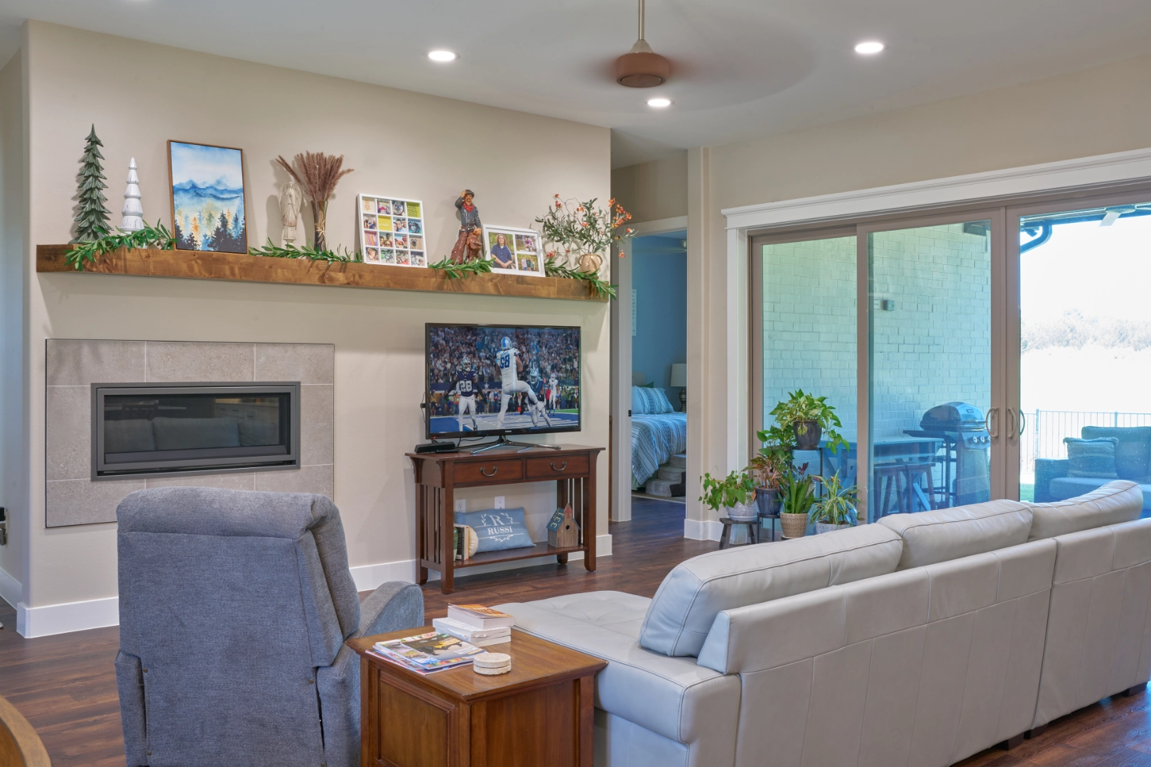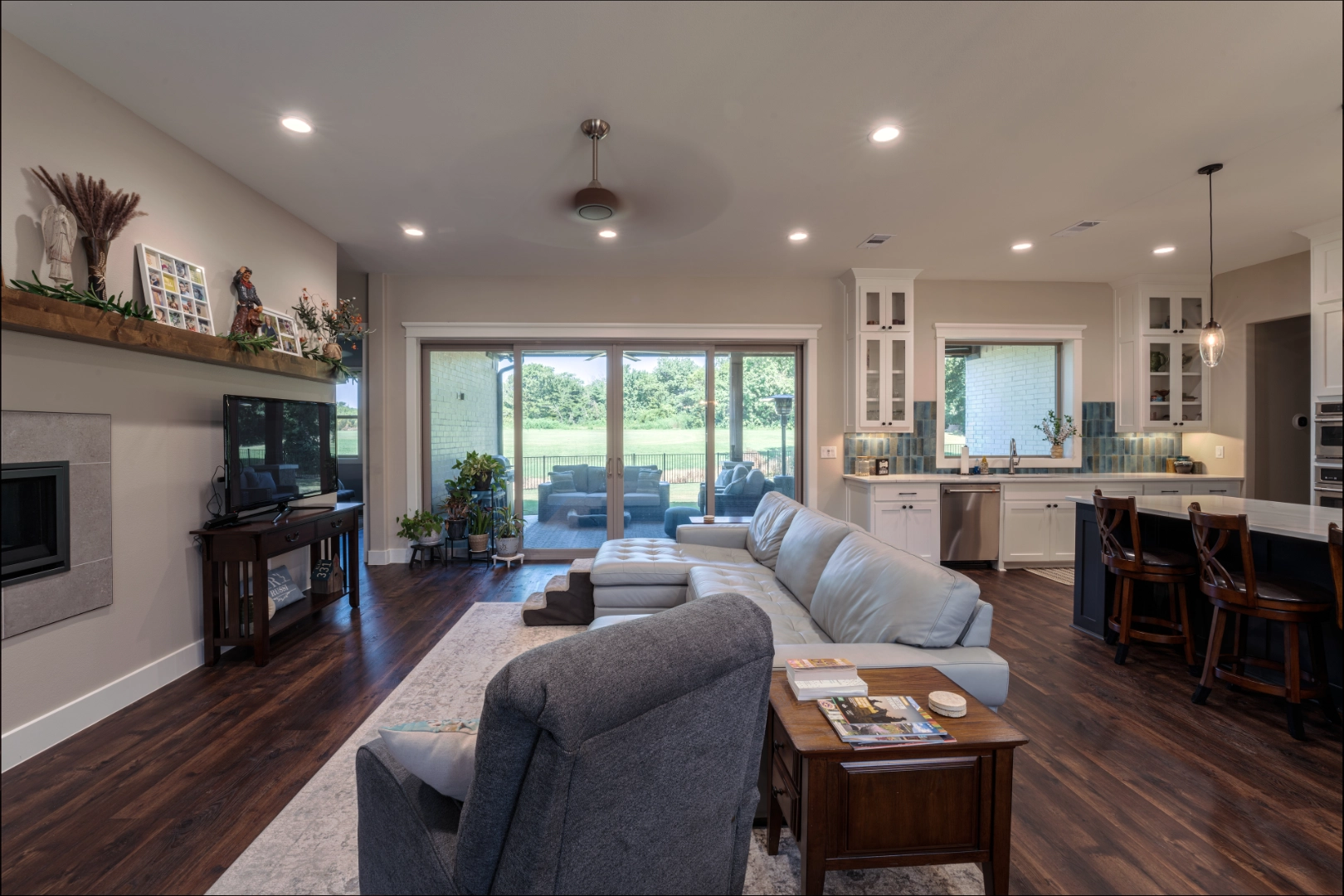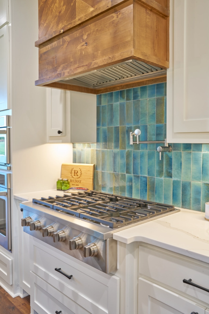 Throughout the main living areas, I chose a neutral palette anchored by rich hardwood floors and gray upholstery, then added personality with a handmade turquoise tile backsplash and subtle blue‑green accents. Thoughtful lighting, functional layouts, and pieces that mix traditional warmth with clean lines make this lakeside home easy to live in every day—calm, collected, and ready for family gatherings by the water