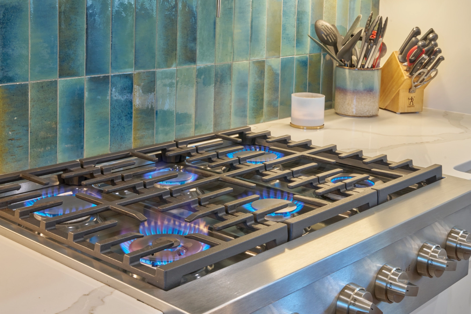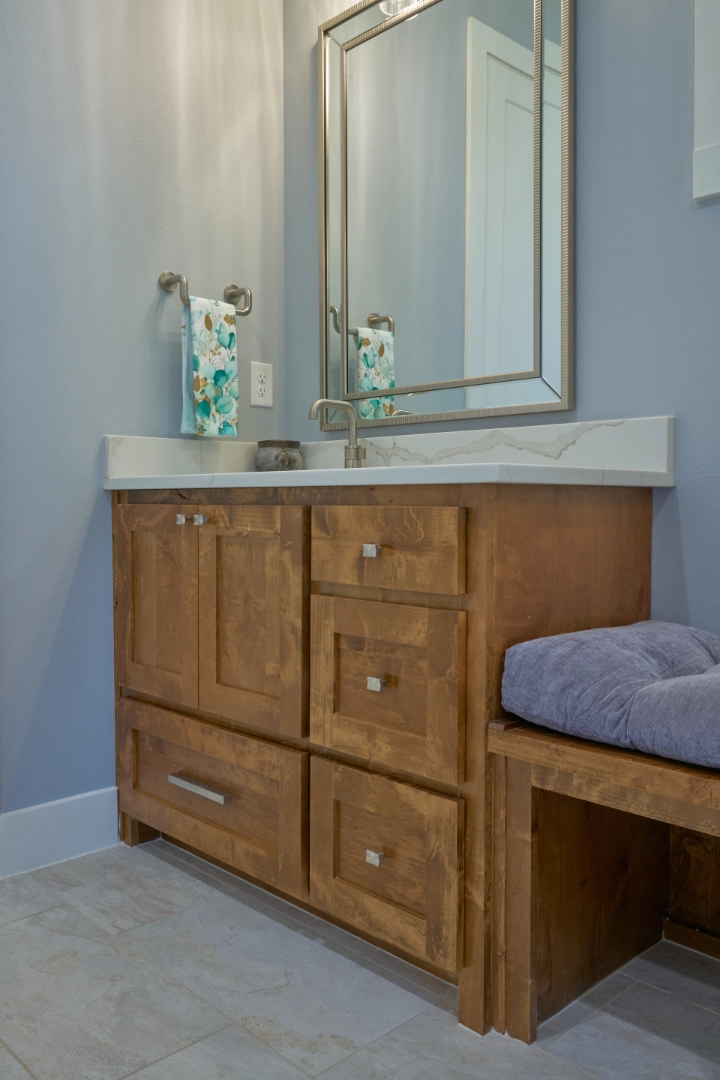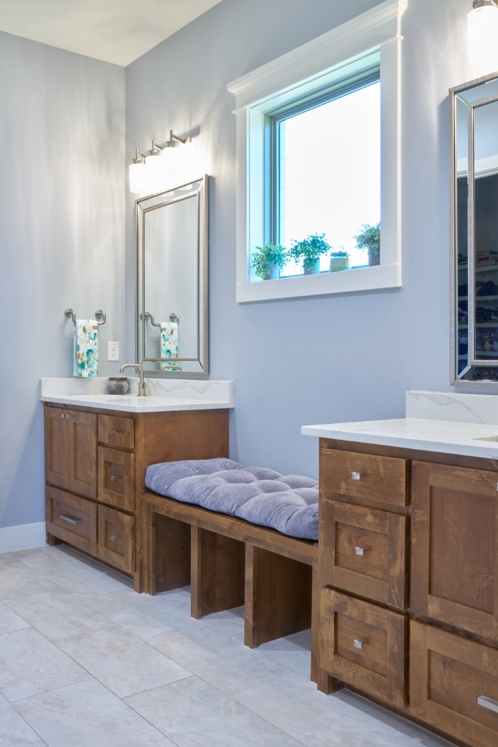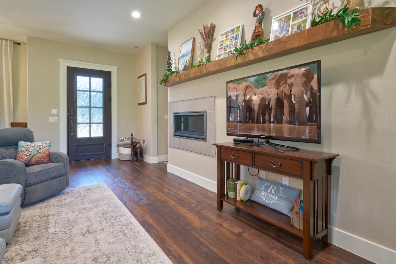 Throughout the main living areas, I chose a neutral palette anchored by rich hardwood floors and gray upholstery, then added personality with a handmade turquoise tile backsplash and subtle blue‑green accents. Thoughtful lighting, functional layouts, and pieces that mix traditional warmth with clean lines make this lakeside home easy to live in every day—calm, collected, and ready for family gatherings by the water
