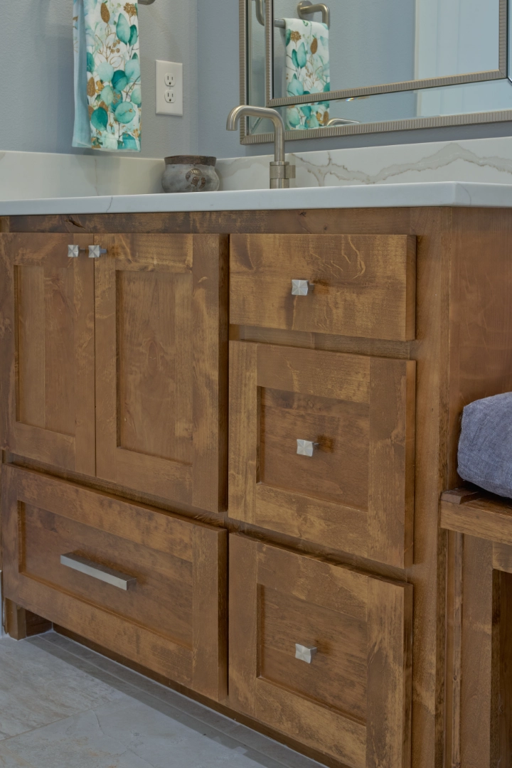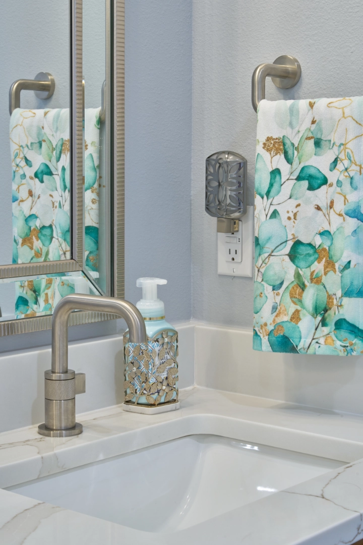 Lakeside Oasis is an open, inviting interior where I used soft grays, warm wood tones, and carefully placed pops of turquoise to bring the feeling of the lake inside. Comfortable furnishings, a seamless flow between living, dining, and kitchen areas, and layered textures create a space that feels both relaxed and refined.